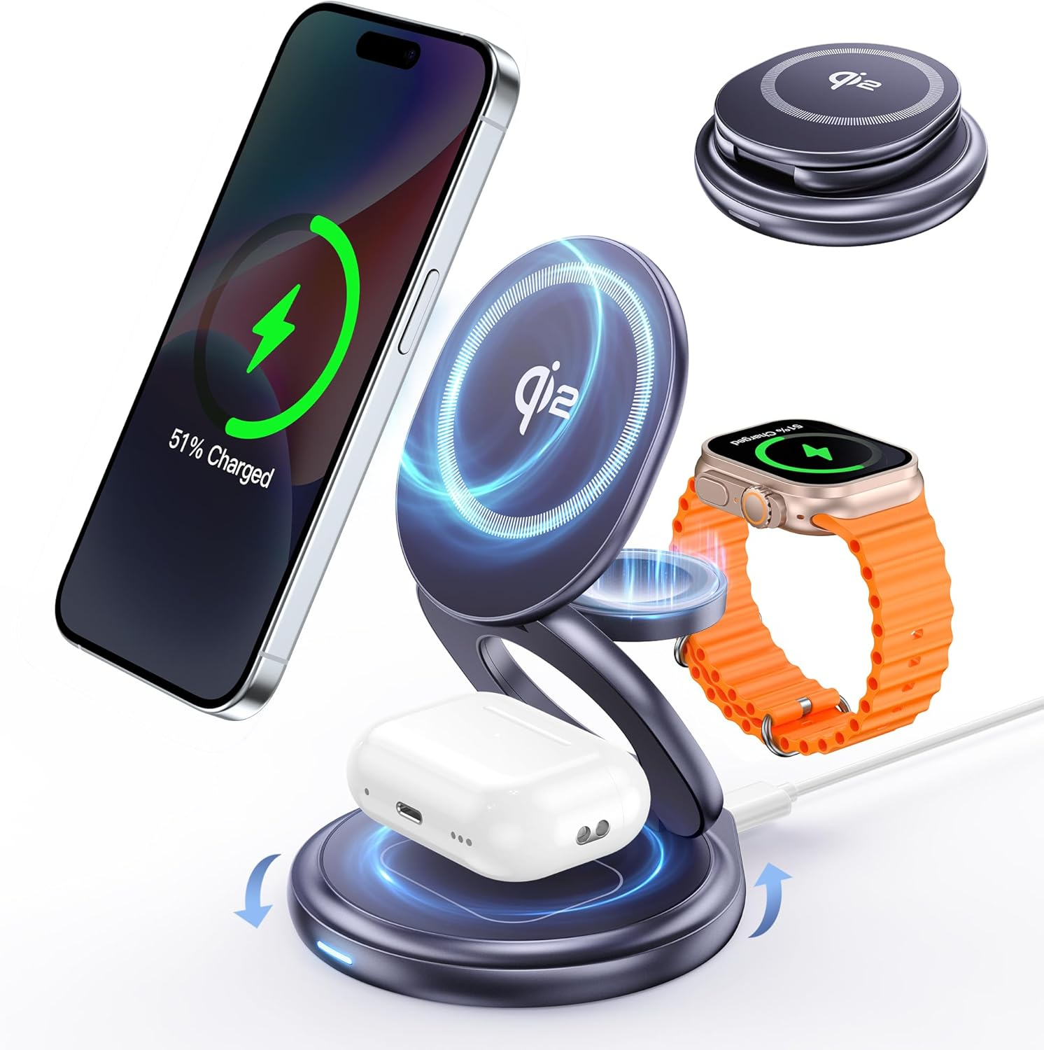 qi2認証・マグセーフ リング&スタンド付・両面同時充電 3in1ワイヤレス充電器「A3Q」