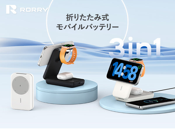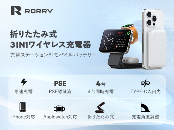- ⭐【3in1ワイヤレス充電器・ステーション】最近では、身の回りのガジェットは全てアップル製品で揃えているという方が多くになりますが、iPhoneやApple Watch、AirPodsを利用していると、充電する際にケーブルが3本必要になり、配線が大変です。これによって、1台デバイスでで3台の充電が同時にできる、3in1ワイヤレス充電器が注目になります!RORRY社の4IN1ワイヤレスモバイルバッテリーはiPhone、AirpodsやApple Watchを同時充電でき、デスク上の配線がスッキリになる一方で、デバイスごとに充電器を変更する手間がありません!そののほか、TYPE-C入出力ポートが搭載されているので、iPhone16/15またはほかのデバイスに2有線で20W急速充電可能です!(ご注意:ワイヤレス充電とケーブル充電を同時に支持できません、優先ケーブル充電)。また、充電器としてだけでなく、充電していない時ステーションとして使えます、自宅やオフィスのデスクへ簡単に立てかけられるため快適に視聴できます。さらに、飛行機や新幹線のテーブルで使う際、わざわざスマホスタンドを持ち歩く手間がかからないので大変便利なワイヤレス充電ステーションです。 .
