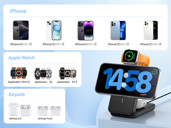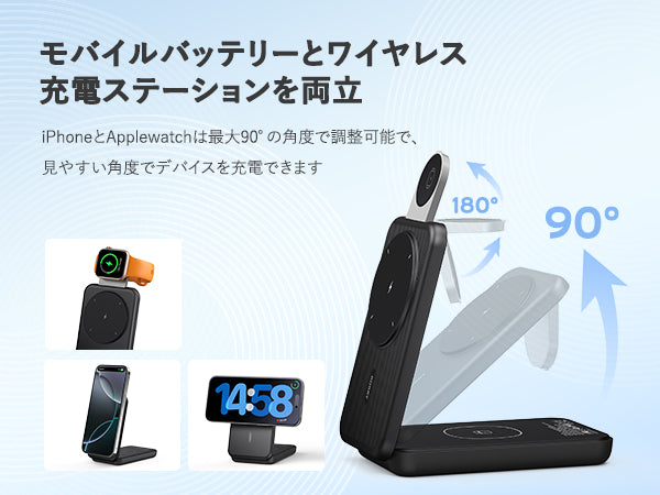 - ⭐【角度調整可能・首や背中の負担が軽減】角度調整ができるものは、見やすい角度にスマホを合わせられるのはもちろん、正しい姿勢を保つために、肩や首の負担を軽減します。RORRY社のスタンド式なモバイルバッテリーはスマホ充電面は90°の範囲で、Applewatch充電面は180°の範囲で無段階調節が可能で,好きな角度でスマホを固定して、充電しながら動画を視聴したり、SNSを閲覧したりすることができるだけではなく、Apple Watchも自分の見やすい正面になる角度にディスプレイを調整でき、時計や通知を把握しやすいです。また、充電中にスマホを操作できるマグネット式スタンドを採用しているでの、縦置き・横置き、どちらの方向でもiPhoneが取り付けられ,動画をよく観る人に適しています。通知や顔認証がしやすく、必要なときにすぐホーム画面を開けられることも利点です!iOS 17/18をアップデートしたら、充電時にスマホスタンドにiPhoneを立てかけておけば、遠くからでも時間を確認でき、カレンダー替わりとしても重宝します。 .