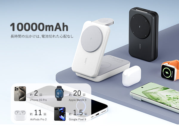 RORRY M3 【10000mAh 大容量・ iphone apple watch airpods 同時充電・完全ワイヤレススタンド】magsafeモバイルバッテリー アップルウォッチ充 電 3台 パススルー 充電ドッグ コンパクト
