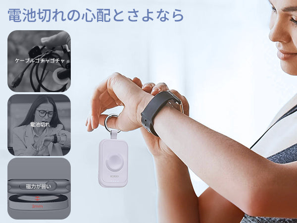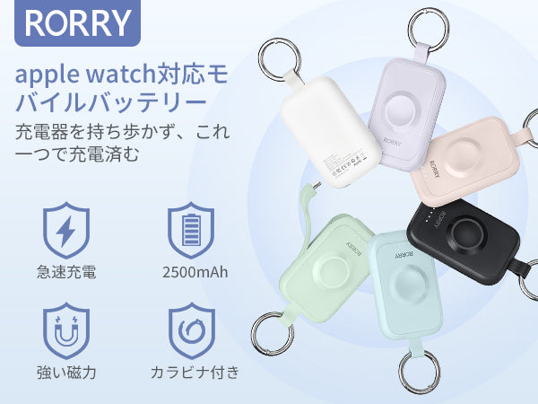 - ⚡️【面倒くさいな充電状況からApple Watchユーザーを解放できたのモバイルバッテリー】Apple Watchのバッテリーが持たない?仕事帰りや出先で、電池切れになってしまうと、駅から出られなくなったり、電車にすら乗れなくなるという面倒なことになりかねません!そんな時、コンパクトなアップルウォッチ対応モバイルバッテリーがあると、電池切れの不安から解き放たれます!2500mAhの容量を備えたRORRY Apple Watch 充電器は短時間でサクッと充電して、Apple Watch電池が満タンの状態に回復できます。モバイル バッテリーは、Apple Watchを5回ほどフル充電できます。毎日愛用しているアップルウォッチの一週間の電量を常備でき、電池切る心配がありません!RORRYモバイル充電器をカバンに備えておけば出先での急な充電切れに焦らず対応でき、旅行や出張、防災まで幅広くお使い頂けます。