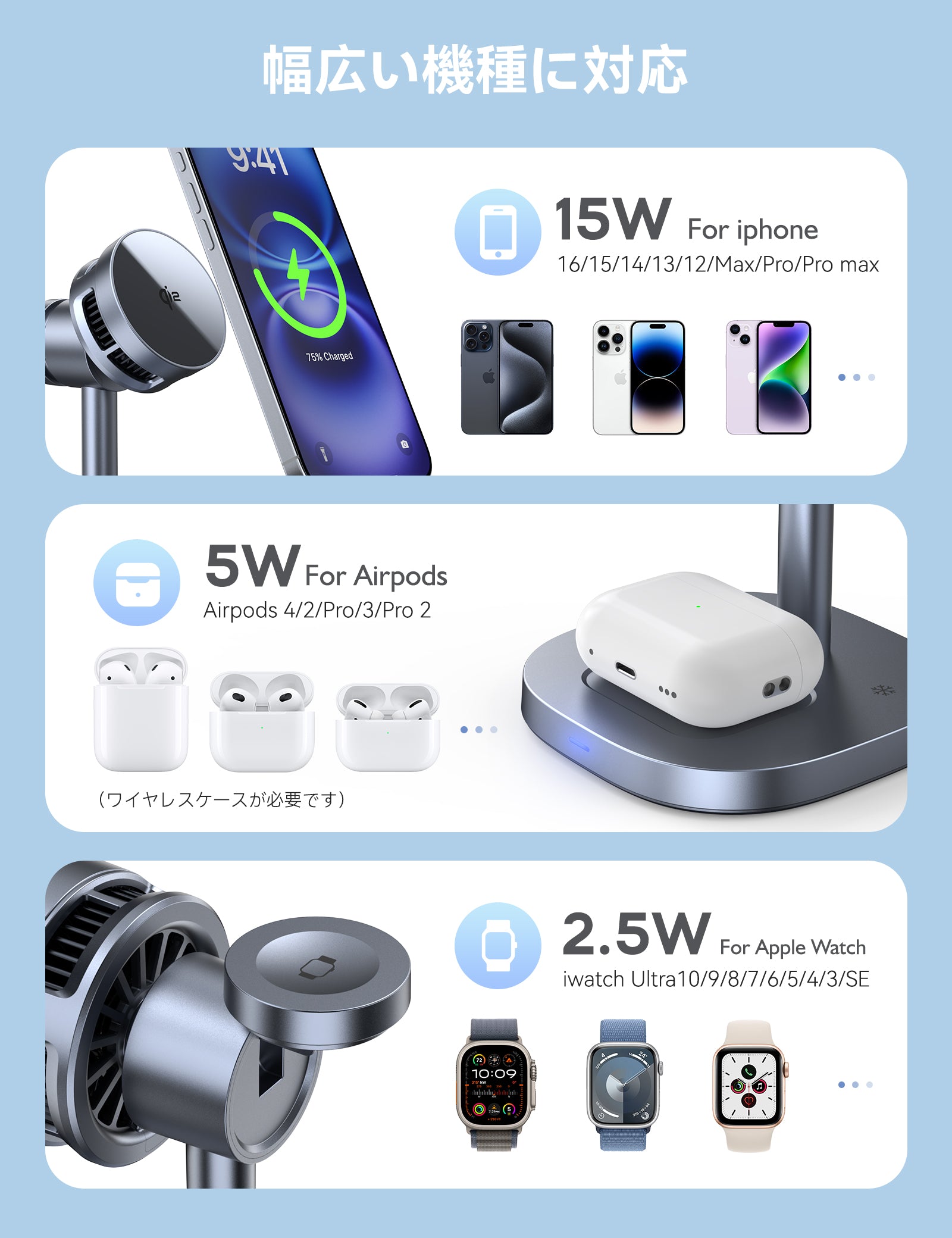 このワイヤレス充電器は、iPhone、Apple Watch、AirPods を同時に充電できる3in1デザインです。
