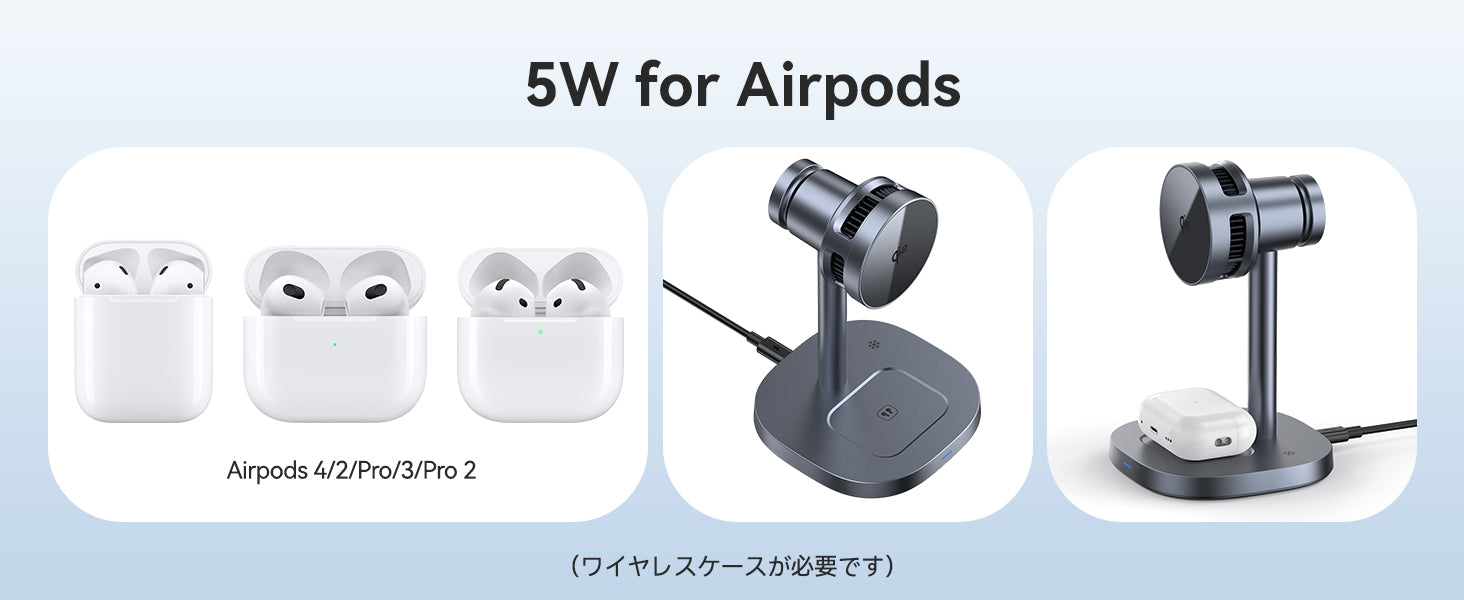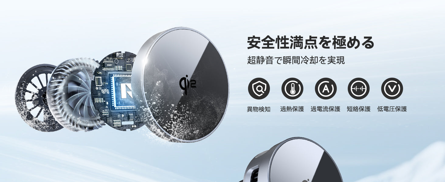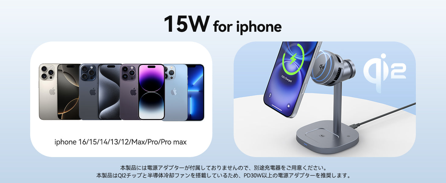 ご注意:本製品には電源アダプターが付属しておりませんので、別途充電器をご用意ください。本製品はQI2チップと半導体冷却ファンを搭載しているため、PD30W以上の電源アダプターを推奨します。(PD30W未満またはPD非対応の充電器を使用した場合、充電に失敗したり、冷却ファンが正常に動作しなかったりします。)