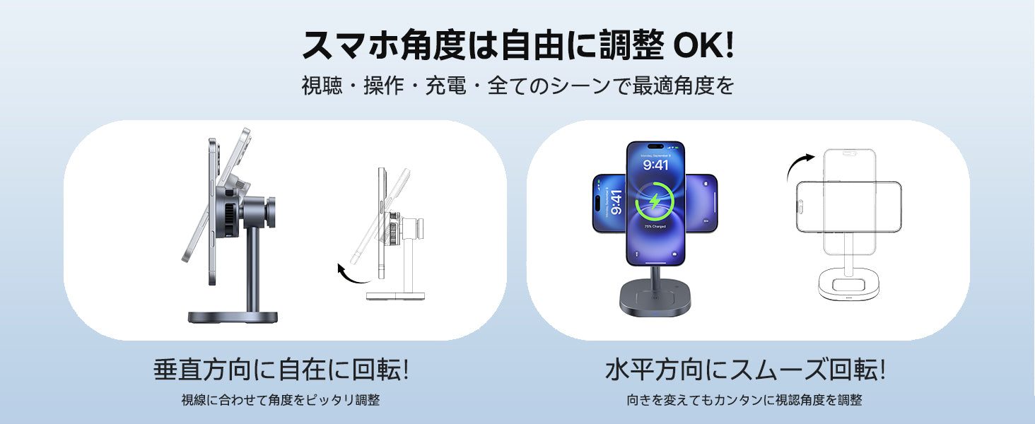 • 【「見る・話す・使う」全シーンで最適角度!人體工学設計で肩颈疲労を一掃】​スマホ充電器は角度調整が可能で、視認性と操作性を高めています。0°から45°まで自由に角度を変更できるため、動画視聴、ビデオ通話、メール確認などの場面に最適な角度を設定できます。角度調整は簡単に行え、しっかりと固定されます。デスクワーク中やソファでくつろいでいる時も、最適な角度で充電しながらスマホを使用できます。
