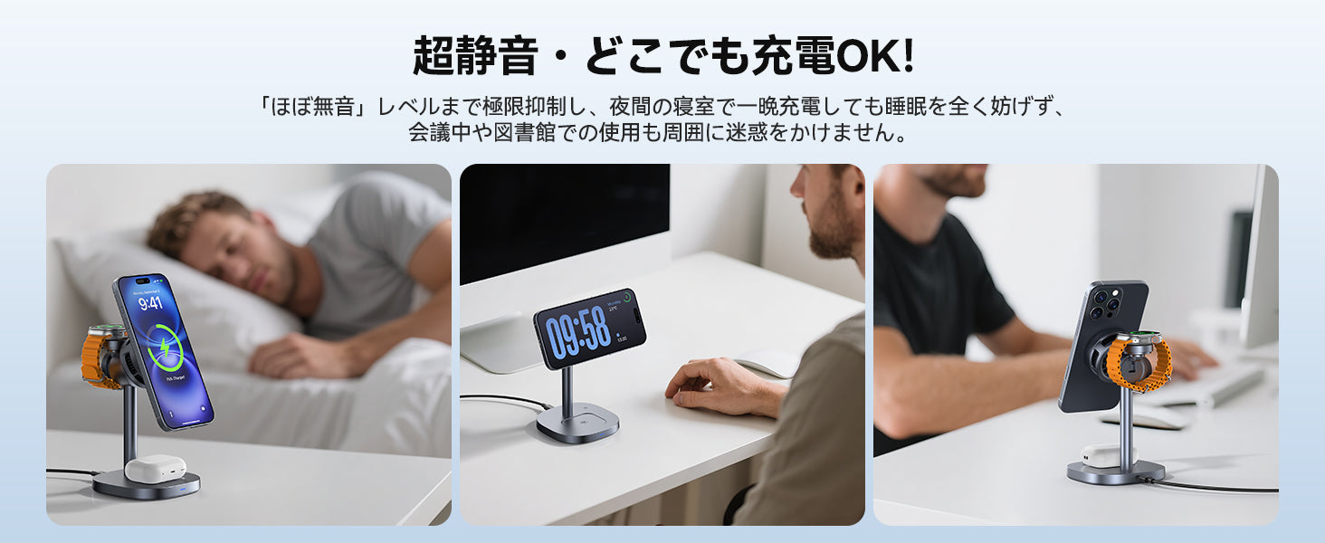 このワイヤレス充電器は、静音設計が特徴の一つとして挙げられています。具体的には、冷却ファンの運転音を「ほぼ無音」レベルまで抑制しているとのことです。これにより、夜間の寝室で一晩充電しても睡眠を妨げず、会議中や図書館での使用も周囲に迷惑をかけないとされています。