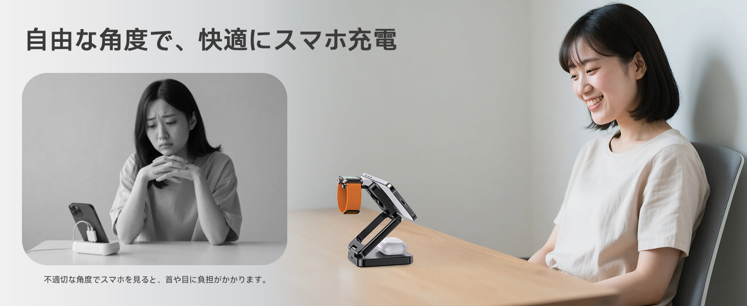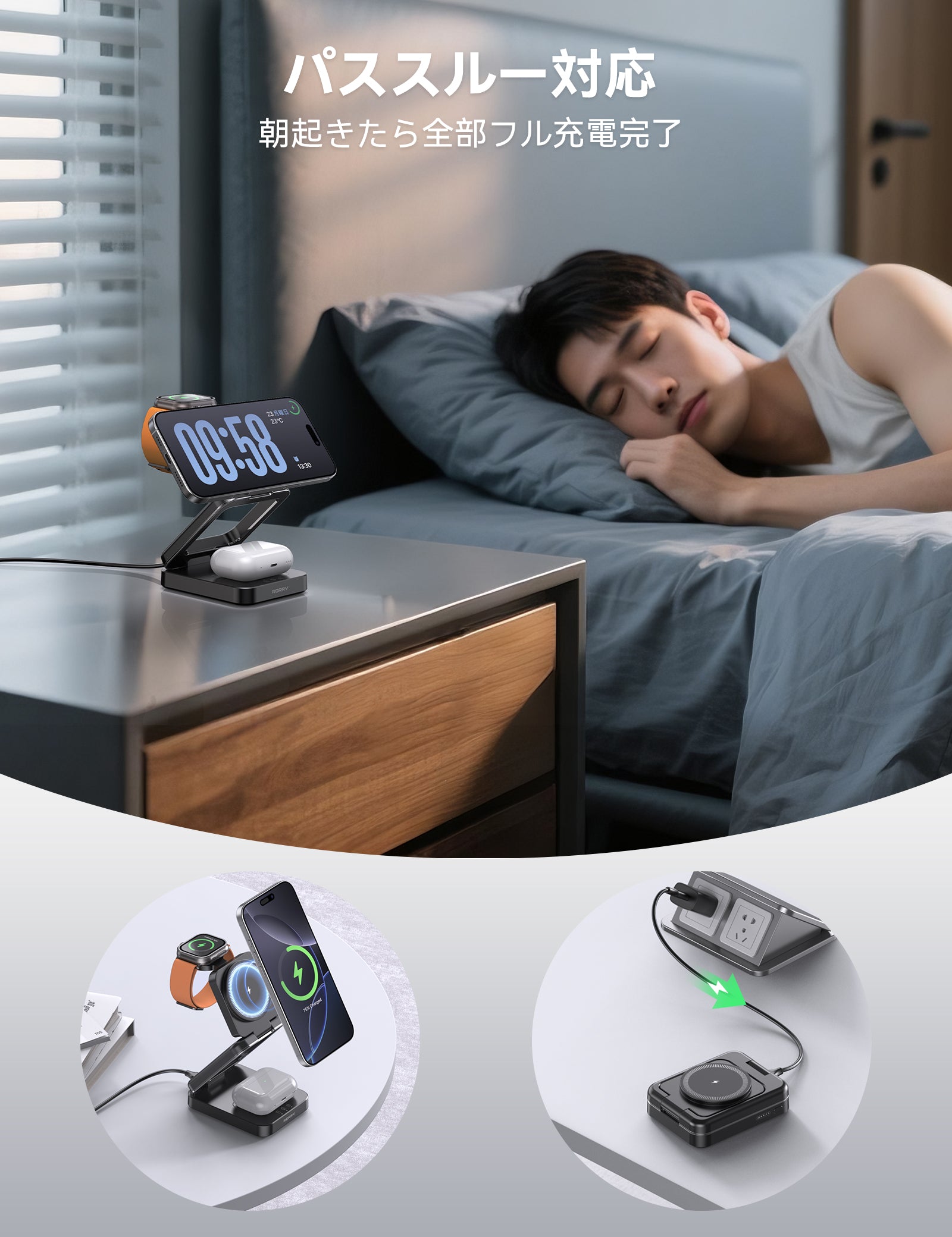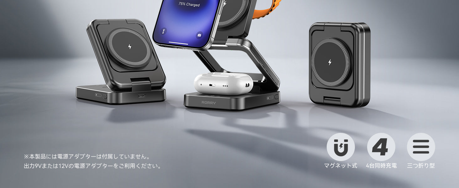 - 【5000mAh内蔵×3in1 充電スタンド!持ち運び型充電スタンドの常識を覆す】近年、3in1 ワイヤレス充電器が急激に普及してきました。複数の機器を同時充電できるこの製品は、人々に充電待ち時間を短縮し、より効率的な時間管理を可能にしています。しかし、従来型の3in1 ワイヤレス充電器は電源ケーブルを接続する必要があり、外出時には不便さを感じることがありました。そこで RORRY は、この問題を解決するため、5000mAh の大容量バッテリーを内蔵した折りたたみ式ワイヤレス充電スタンドを新たに開発しました。「外出時に充電器のケーブルを忘れた!」「カフェのコンセントが遠すぎて充電できない…」従来のワイヤレス充電器の「場所に縛られる」課題を、5000mAhバッテリーと折りたたみデザインが完全解決!ケーブル不要でiPhone、Apple Watch、AirPodsなどをいつでもどこでも充電できます。外出先でも、快適な充電環境をお楽しみいただけます。