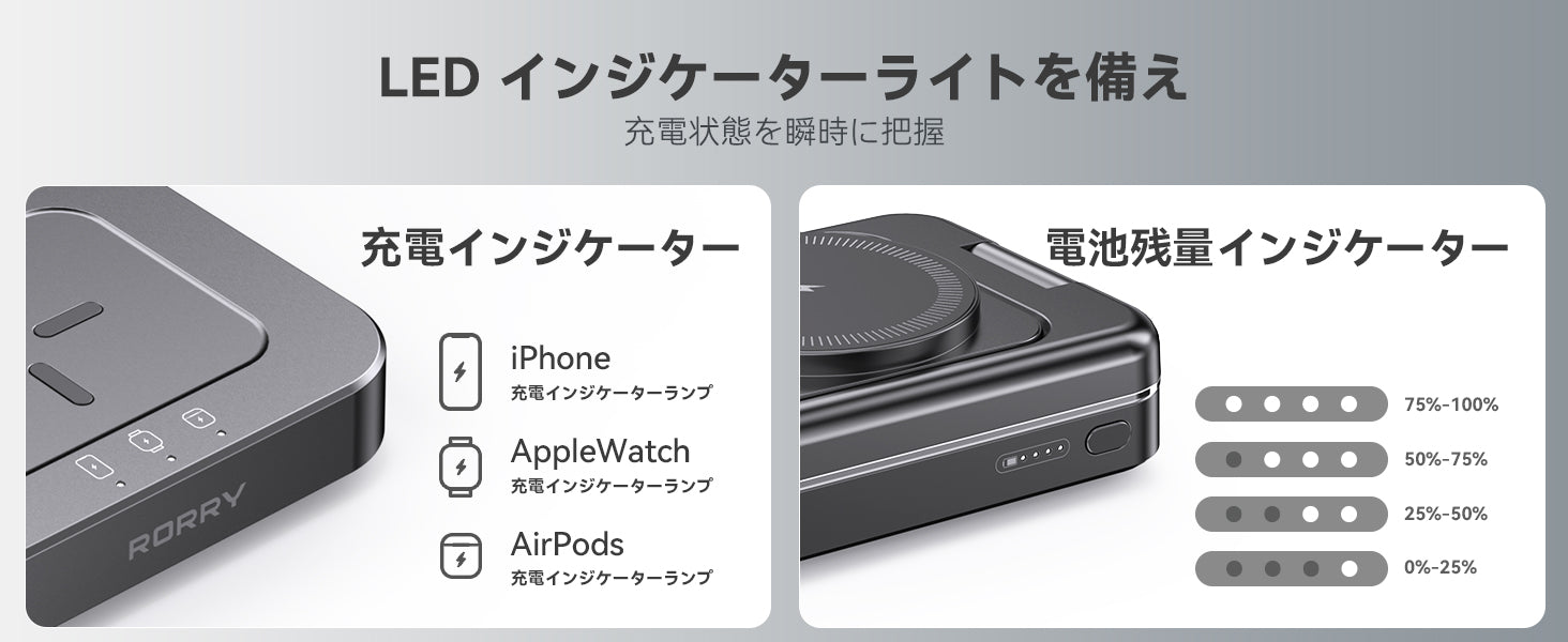 - 【LEDライト×一目瞭然!充電状況が瞬時にわかる視覚革命】RORRY 3in1ワイヤレス充電モバイルバッテリーには、3 つの充電インジケーターと4分割の電池残量インジケーターが搭載されています。インジケーターの点灯状態で、 iPhone、Apple Watch、AirPodsの充電状態が一目で把握できます。電池残量インジケーターは、モバイルバッテリーの残量を 4 段階で表示し、残量が多いほど多くの LED が点灯します。このように、充電状況と電池残量を簡単に確認できるため、充電器をいつも適切な状態で使用できます。