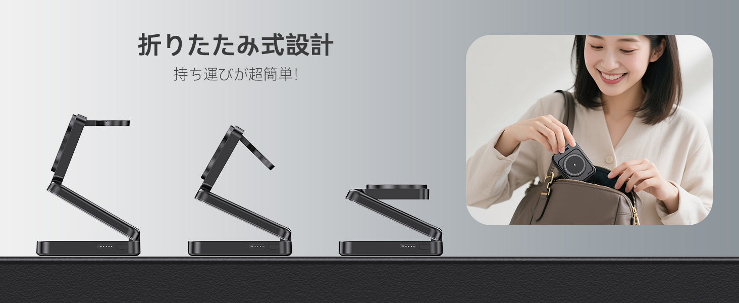 この充電器は折りたたみ式のデザインで、コンパクトなサイズにすることができます。使用後は簡単に折りたたんで9.7cm×7.5cm×3.2cm のサイズになります。オフィスの机の片隅や、飛行機の小さなテーブルにもスッと置けるため、持ち運びに便利です。