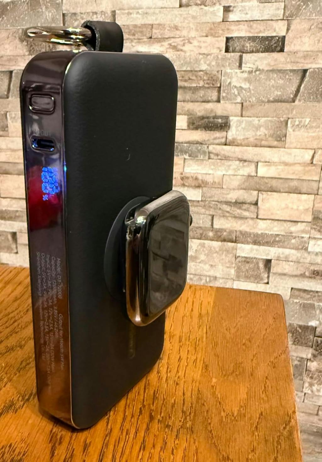 ステンレスケースの重いタイプでもモバイルバッテリーを立てた状態でくっつきます。