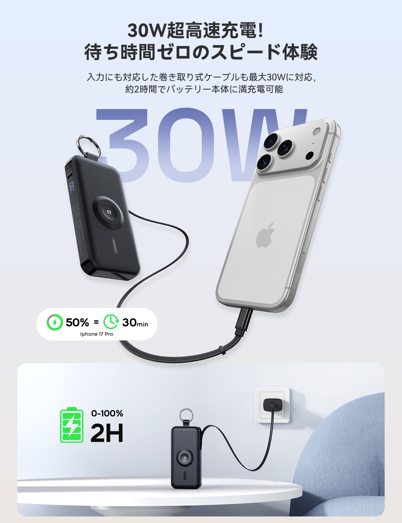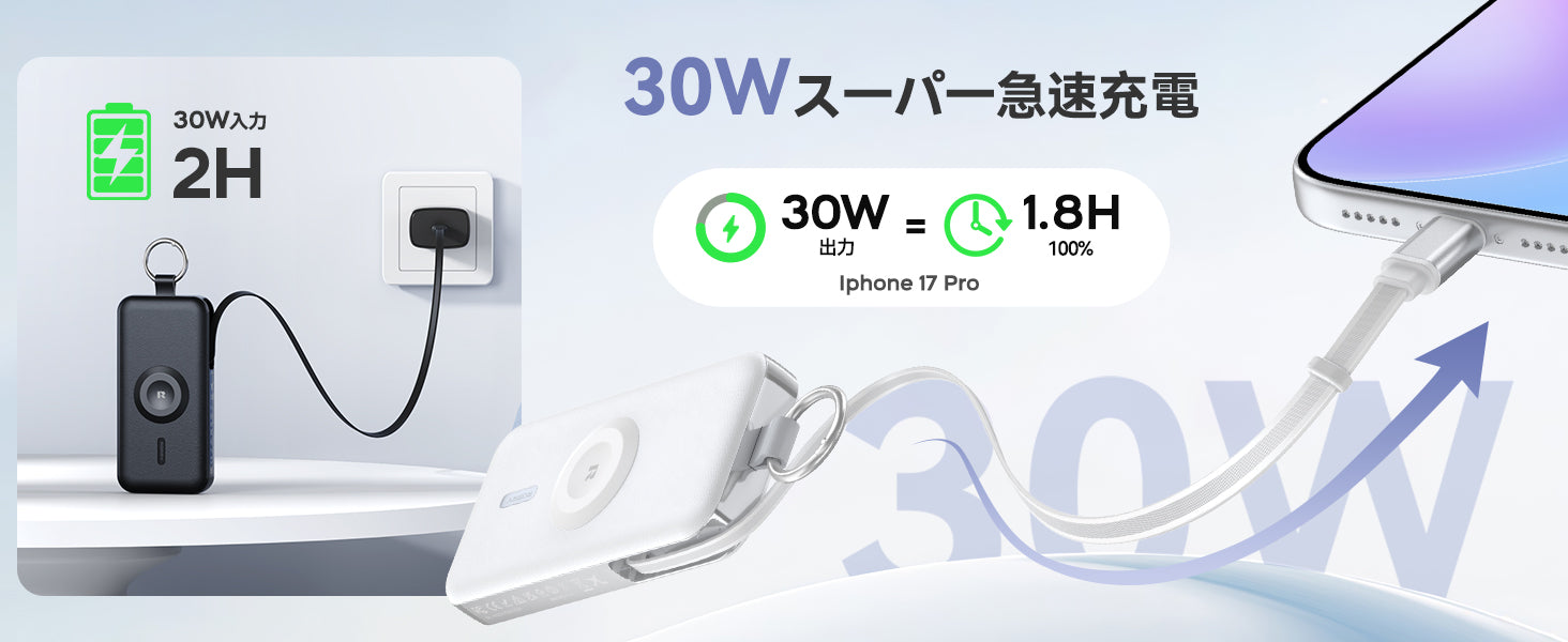 このモバイルバッテリーは30Wの急速充電に対応しており、iPhone 17なら約2時間でフル充電が可能です。