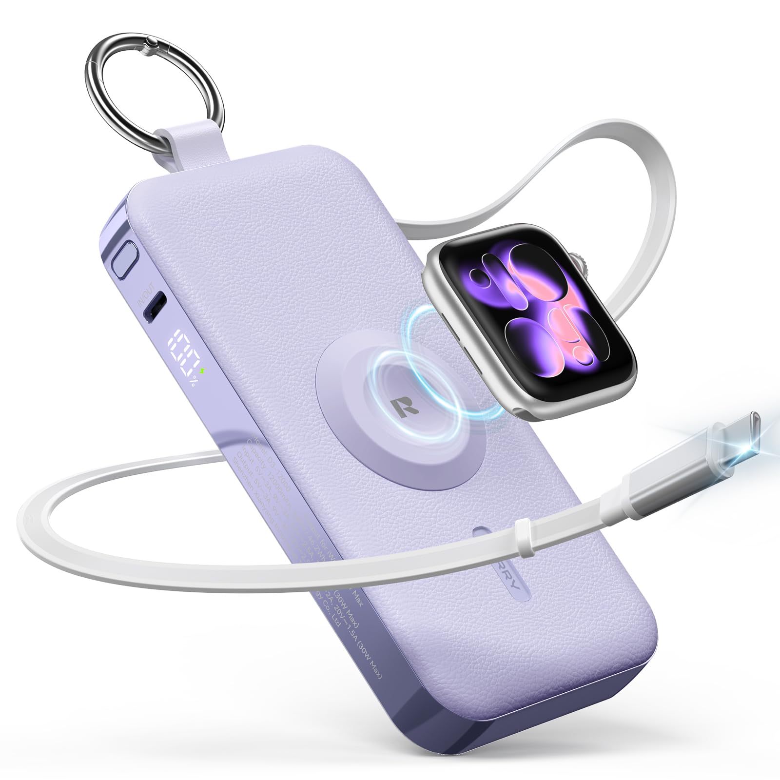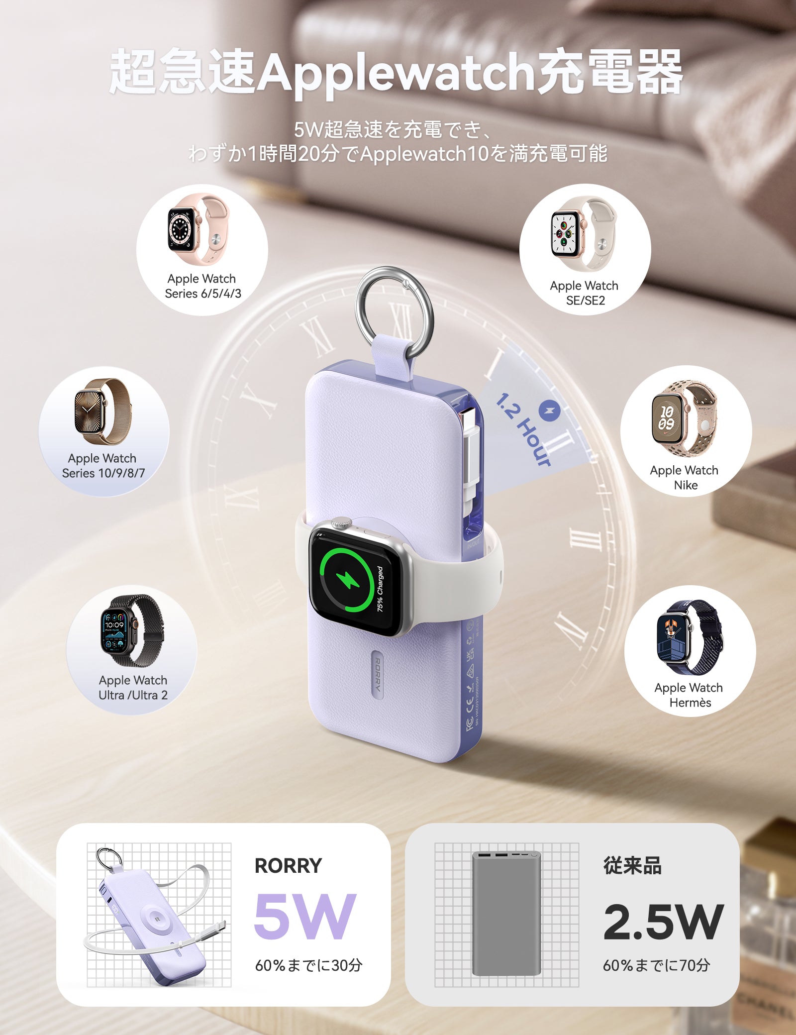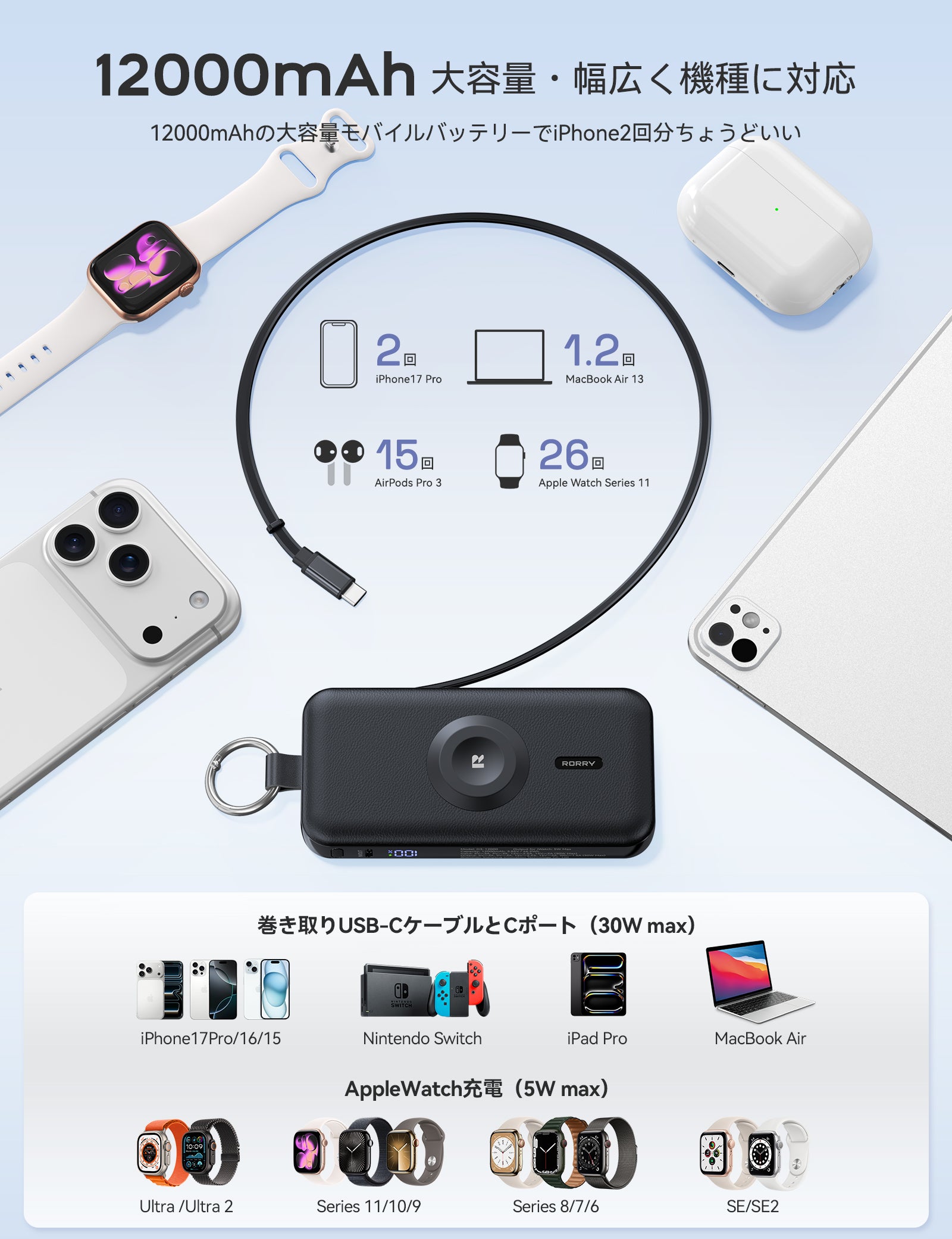 - 【Apple WatchもiPhoneもすばやく充電|忙しい毎日にうれしい高速充電対応】Apple WatchやiPhoneのバッテリー切れで困った経験はありませんか?RORRYの多機能モバイルバッテリーは、Apple Watch急速充電モジュール(最大5W)を搭載して、Ultra 2/Series 11〜S7まで幅広く対応します。2.5W充電器と比べて約3倍の速さで充電でき、Apple Watch S11ならわずか30分で約58%まで充電可能で,忙しい朝の支度中や外出前の短時間でも、十分なバッテリーを確保できるのが魅力です。内蔵ケーブルとUSB-Cポートはどちらも急速充電対応で、30Wの出力を実現し,iPhone 17なら約2時間でフル充電でき、iPhone 17シリーズ、iPad、MacBook、Nintendo Switchなど幅広いデバイスを急速充電することができます。これ1台で複数デバイスをまとめて急速充電できるため、旅行や出張時もケーブルの煩わしさから解放され、スマートに充電時間を短縮できる快適な体験をお届けします。