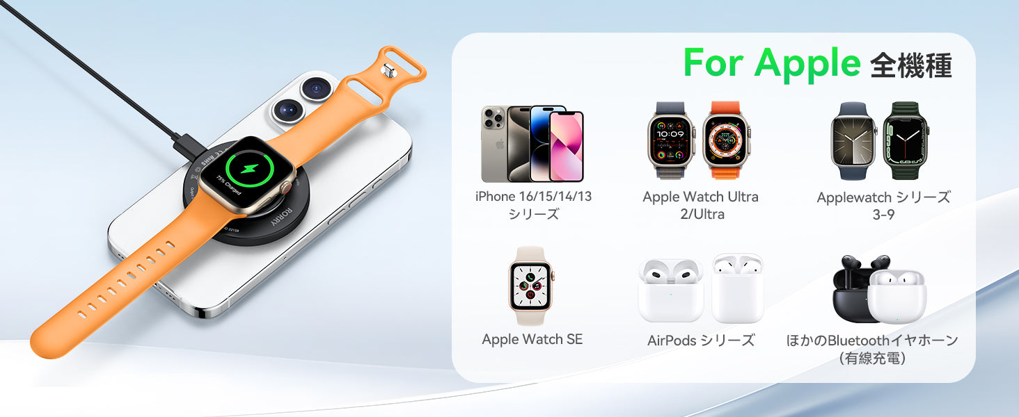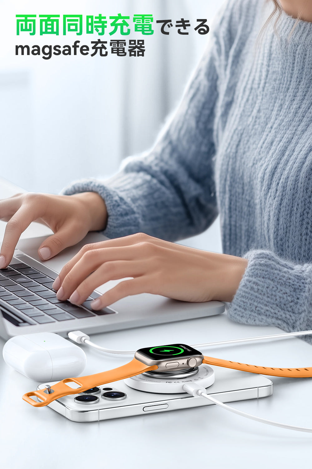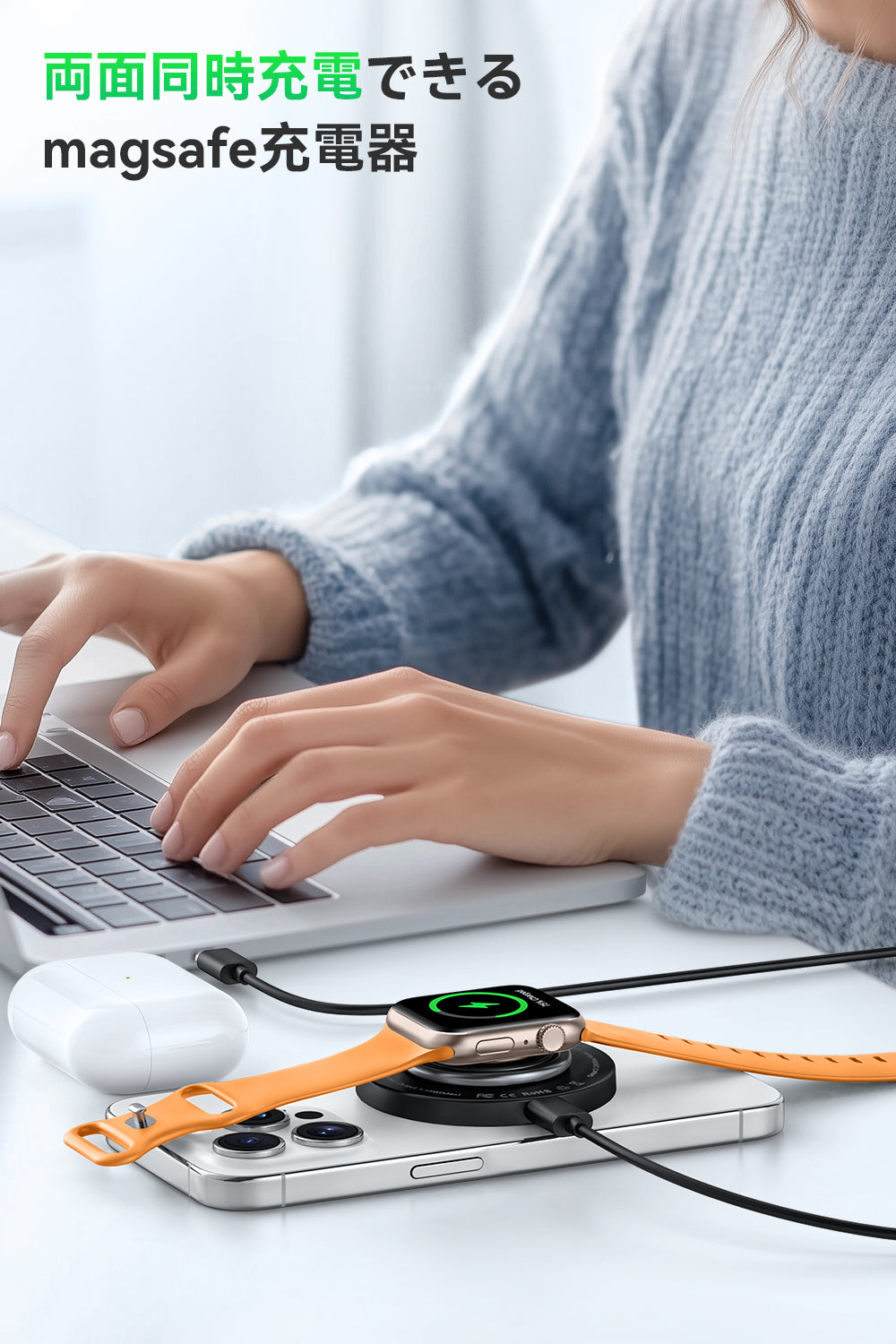 このワイヤレス充電器は、iPhone 17、iPhone 16、iPhone 15、iPhone 14、iPhone 13、iPhone 12シリーズ、Google Pixel 10シリーズ、AirPods、Apple Watchなど、複数のデバイスに対応しています。