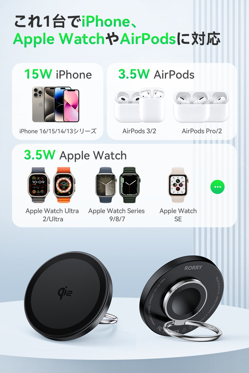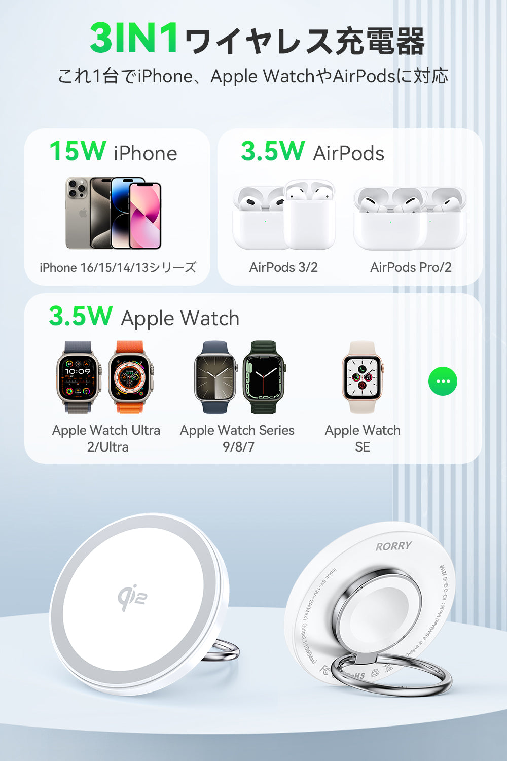 RORRY A3 超小型Qi2 3in1ワイレス充電器(15W・リングスタンド機能付)
