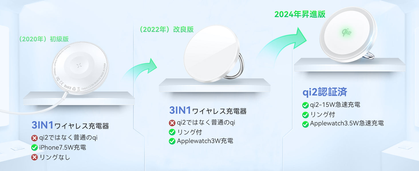 - 【q2公式認証qi2充電器・真15w出力で急速充電可能】ワイヤレス充電の普及に伴い、ますます多くの人がワイヤレス充電器を利用してスマホを充電しています。しかし、ワイヤレス充電自体の欠点により、QI充電はお客様のニーズを満たすことが難しくなっています。そのような時に、充電速度がより速く、放熱性がより良く、より安全なQI2技術が登場しました!RORRY社の3in1ワイヤレス充電器はqi2公式認証を取得して(QI-ID:22526)、充電速度が実際に15Wに達し、qi1充電速度の2倍の速さを実現しました!約30分でiPhone15に30%ぐらいに充電可能で、お客様の充電時間を大幅に短縮します!忙しい時間でも素早く充電できます!また、優れた放熱チップも搭載しており、高速充電時でも充電温度を適切にコントロールできるため、お客様のスマートフォンを十分に保護することができます。さらに、幅広いの互換性で、iPhoneの以外に、Google pixel/Samsungなどスマホも充電可能です!qI1は基本的なワイヤレス充電のニーズを満たしますが、qI2は最新技術と高性能を求めるユーザーに最適です。ぜひRORRY社のqi2充電器を試してください!。