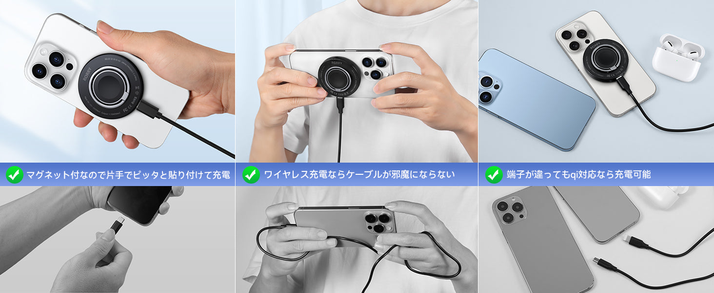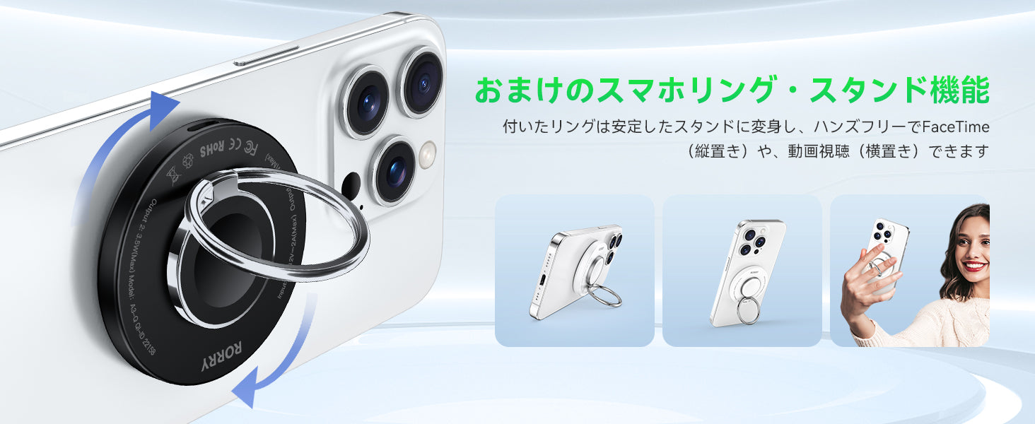 - 【magsafeリングとスタンド機能付きのmagsafe充電器】RORRY社のmagsafe充電器は充電機能の以外、背部にリングが付いて、スマホリングやスタンドとしても使えます!スマホリングは落下防止に役立つだけではなく、スマホを立てかけるためのスタンドの役割も果たしてくれます!リング部分は180度まで倒れるので、角度を自由に微調整できるので便利です。リングの付け根部分がマグネット式なので360度回転可能でスマホを縦置き・横置きの両方とも立てられました。そうすると、動画視聴時に両手を解放できるので、寝転がりながらドリンクを飲み、リラックスしながら映画を見ることができます。また、充電ケーブルを繋いて充電するすることがだけではなく、充電ケーブルは取り外す可能の設計で、単純にスタンドとしても使えるのでもっと便利です。